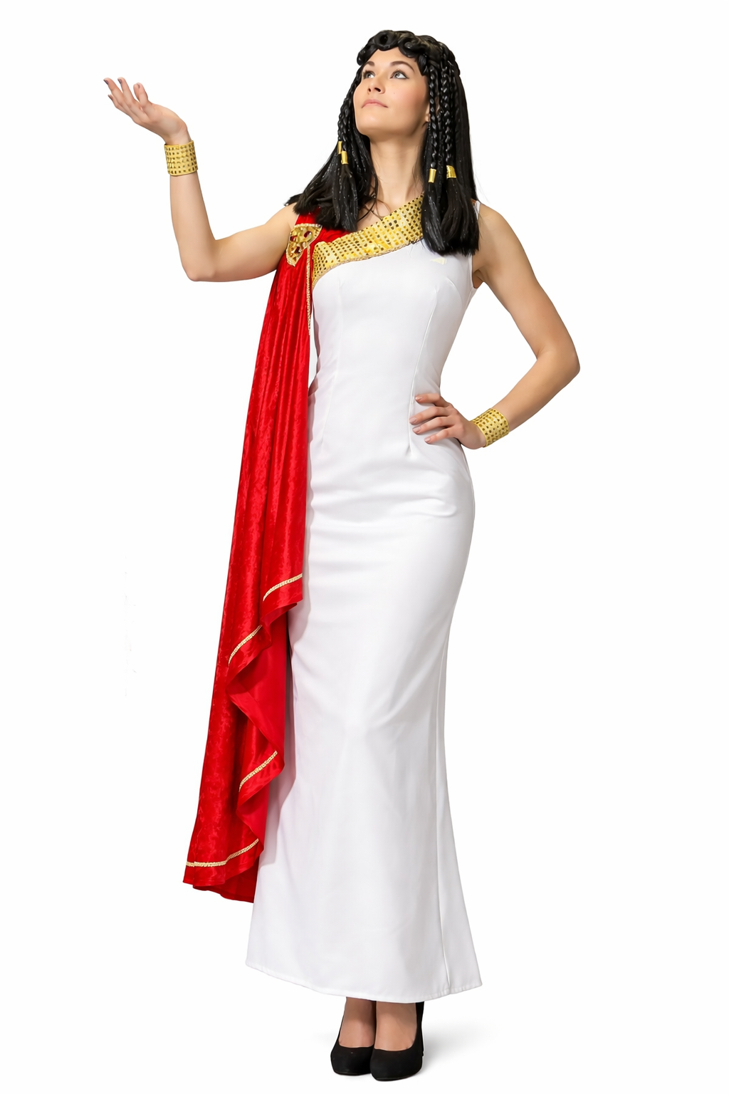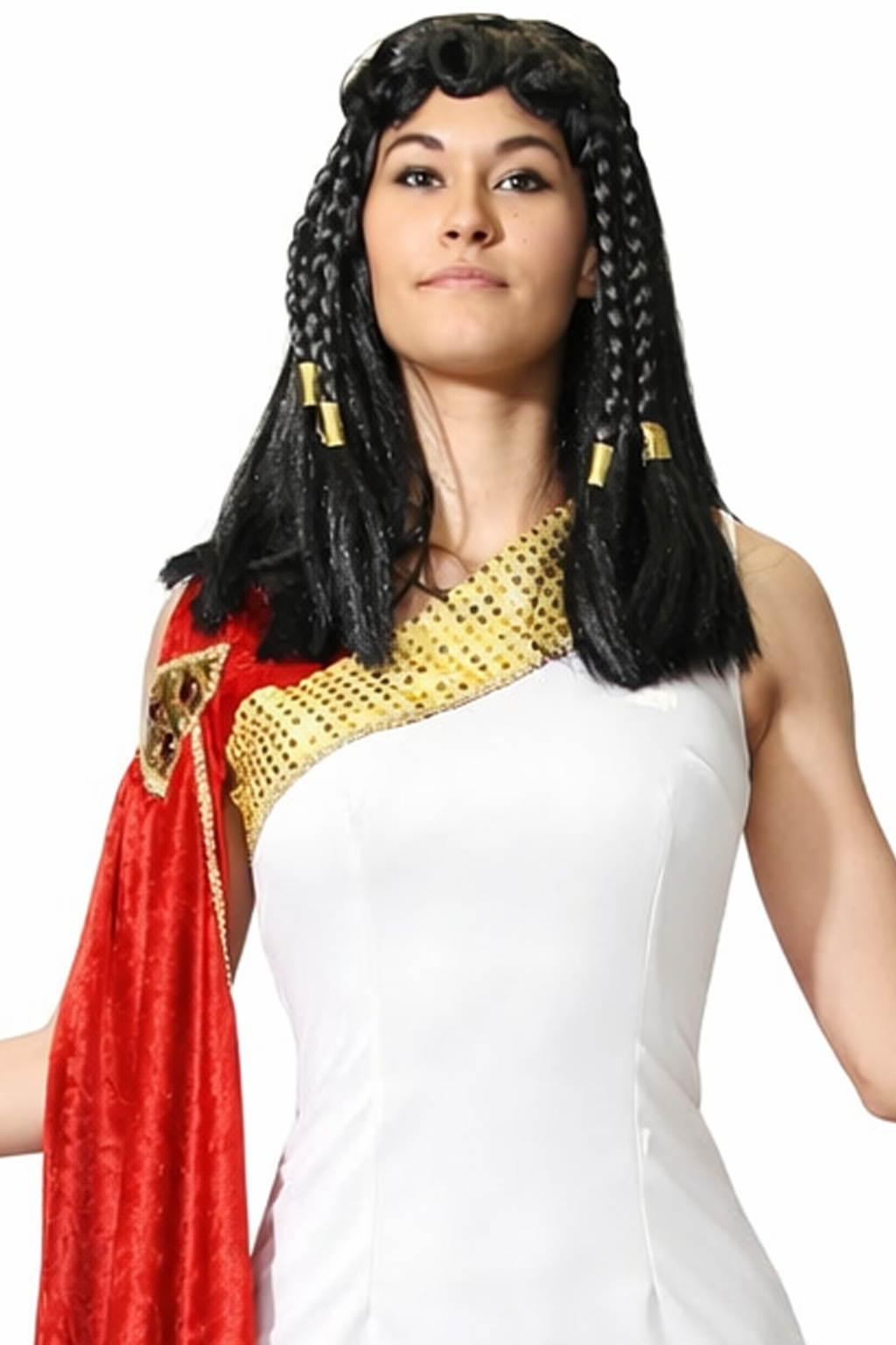 Im Zentrum steht das lange, weiß gehaltene Kleid im Toga-Stil. Die Gestaltung orientiert sich an klassischen Darstellungen, wie man sie aus Skulpturen, Wandmalereien und modernen Interpretationen antiker Gewandungen kennt: eine ruhige, helle Grundfläche, die als Bühne für die farbigen und goldfarbenen Elemente dient. Darüber liegt eine kräftig rote Drapierung über der Schulter, die den antiken Charakter deutlich betont und gleichzeitig ein markantes Farbsignal setzt. Die Kombination aus Weiß und Rot wirkt besonders eindrucksvoll und passt hervorragend zu Themenabenden, bei denen ein „göttlicher“ oder historischer Auftritt gefragt ist. Goldfarbene Akzente ergänzen das Gesamtbild und geben dem Kostüm eine feierliche, zeremonielle Note – wie man sie aus Inszenierungen rund um den Olymp oder die römische Gesellschaft kennt.