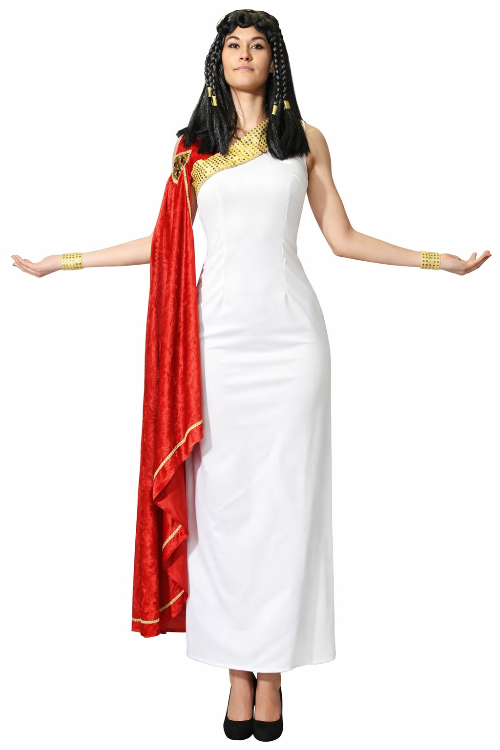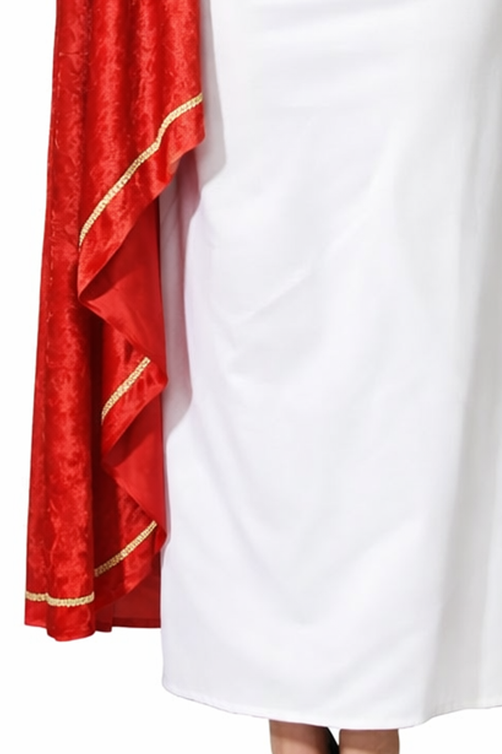 Auch fotografisch spielt das Design seine Stärken aus, weil die Farben deutlich voneinander abgegrenzt sind und der antike Charakter sofort lesbar ist. Weiß als Basis, Rot als dominanter Akzent und Gold als dekorativer Abschluss ergeben eine klassische Farbkombination, die in Bildern schnell wirkt und den historischen Stil unterstreicht. Dadurch eignet sich das Kostüm ebenfalls für Motto-Fotos, Event-Aufnahmen oder Inszenierungen, bei denen ein klarer, antiker Look wichtig ist.