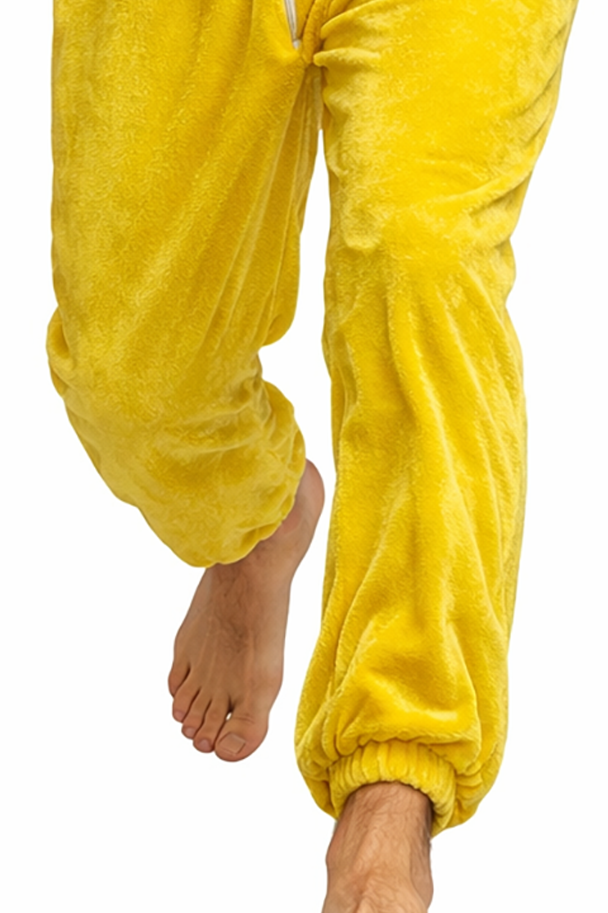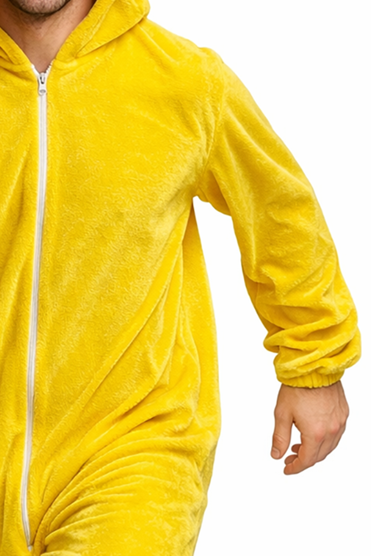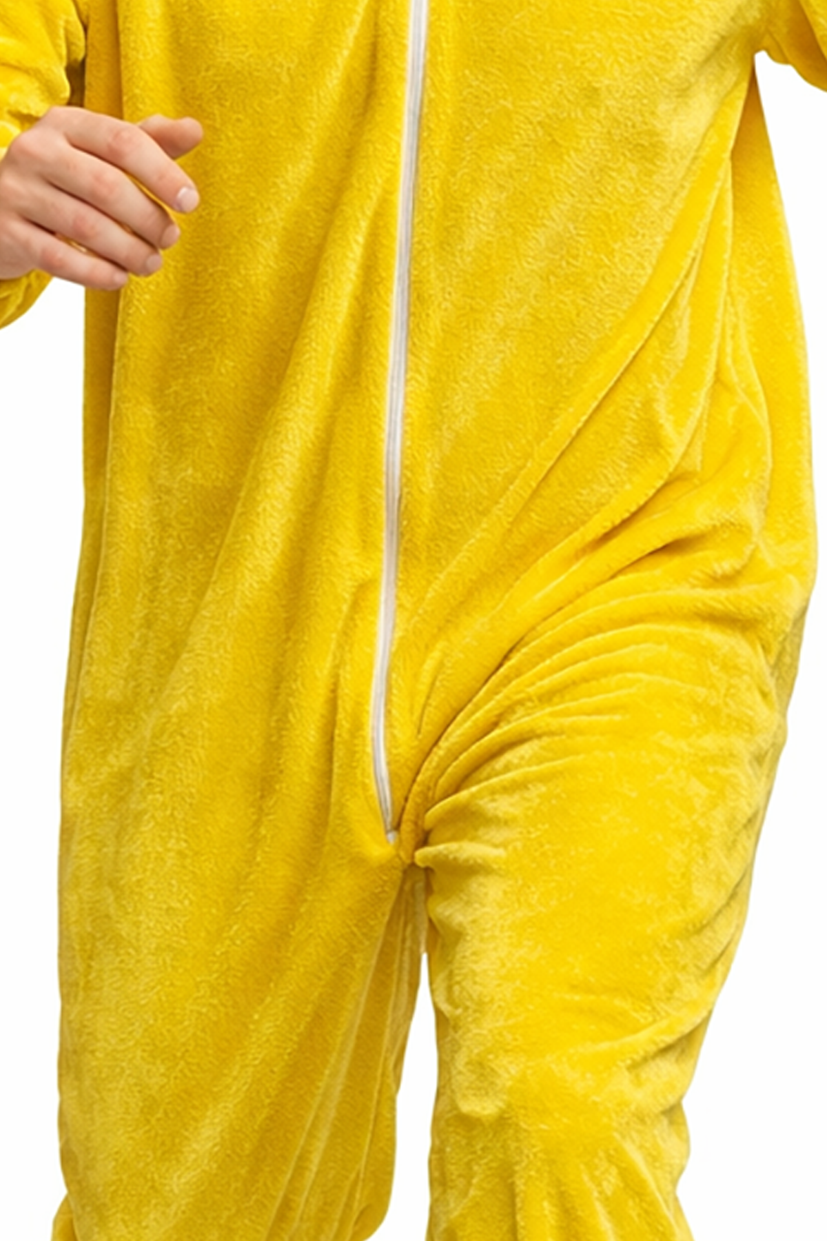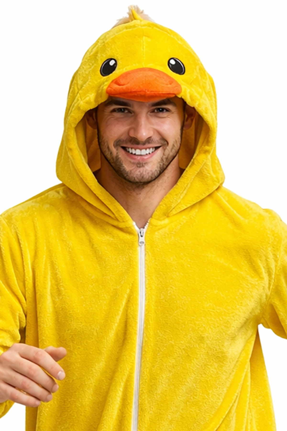 Der Overall ist komplett in leuchtendem Gelb gehalten und sorgt damit für echte Hingucker-Momente. Die Kapuze ist mit einem niedlichen Entenkopf ausgestattet, inklusive Augen und einem auffälligen, orangefarbenen Schnabel. Trägst du die Kapuze und senkst leicht den Kopf, wirkt es so, als hättest du eine Maske auf – dabei bleibt dein Gesicht frei.