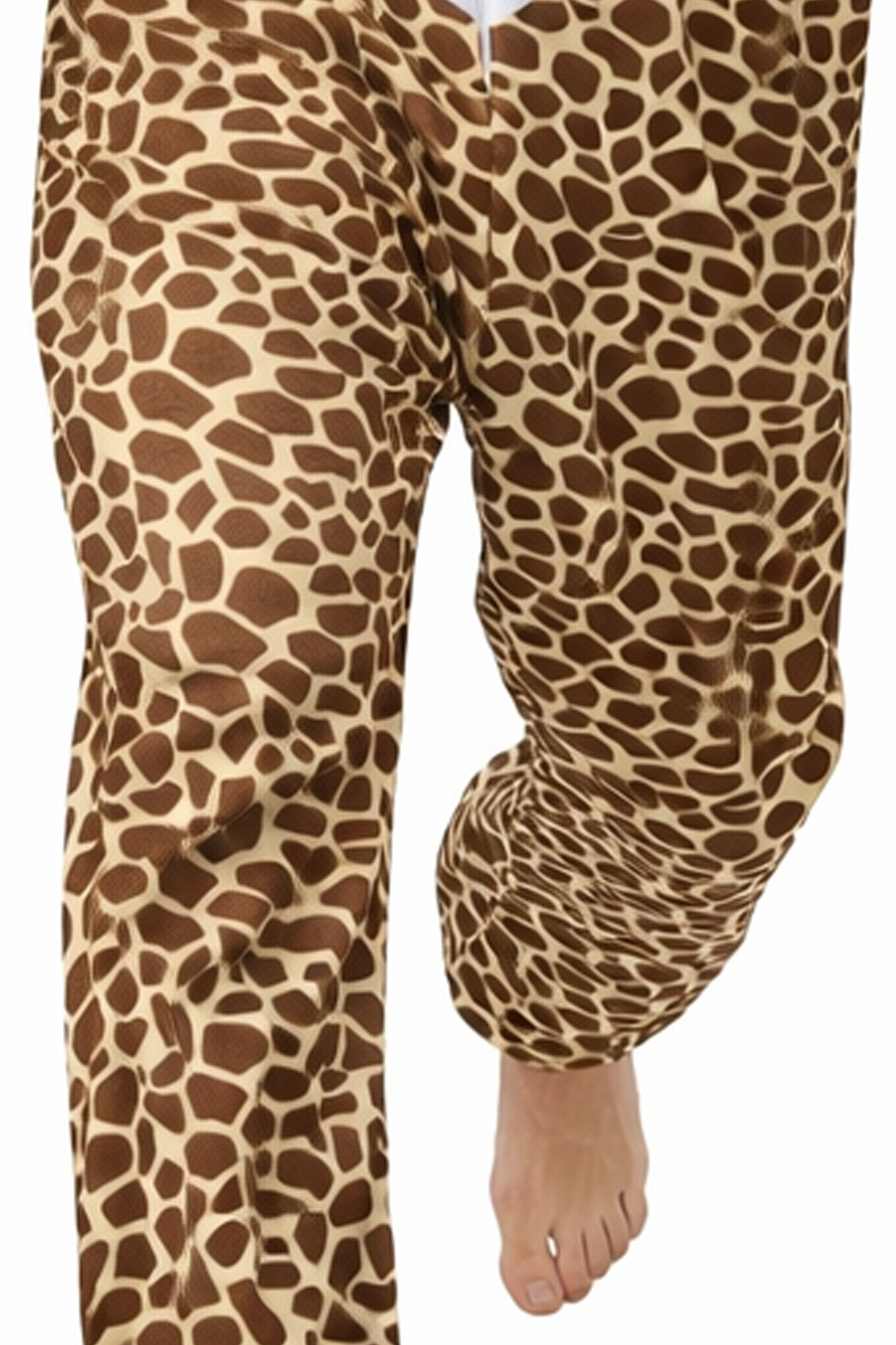 Der Overall ist mit dem typischen Giraffenmuster in Braun und Beige bedruckt und verfügt über eine Kapuze mit angenähtem Giraffenkopf samt Ohren, Augen und Hörnern. Trägst du die Kapuze und beugst leicht den Kopf nach vorne, wirkt es, als würdest du eine Maske tragen – dabei bleibt dein Gesicht offen und frei.