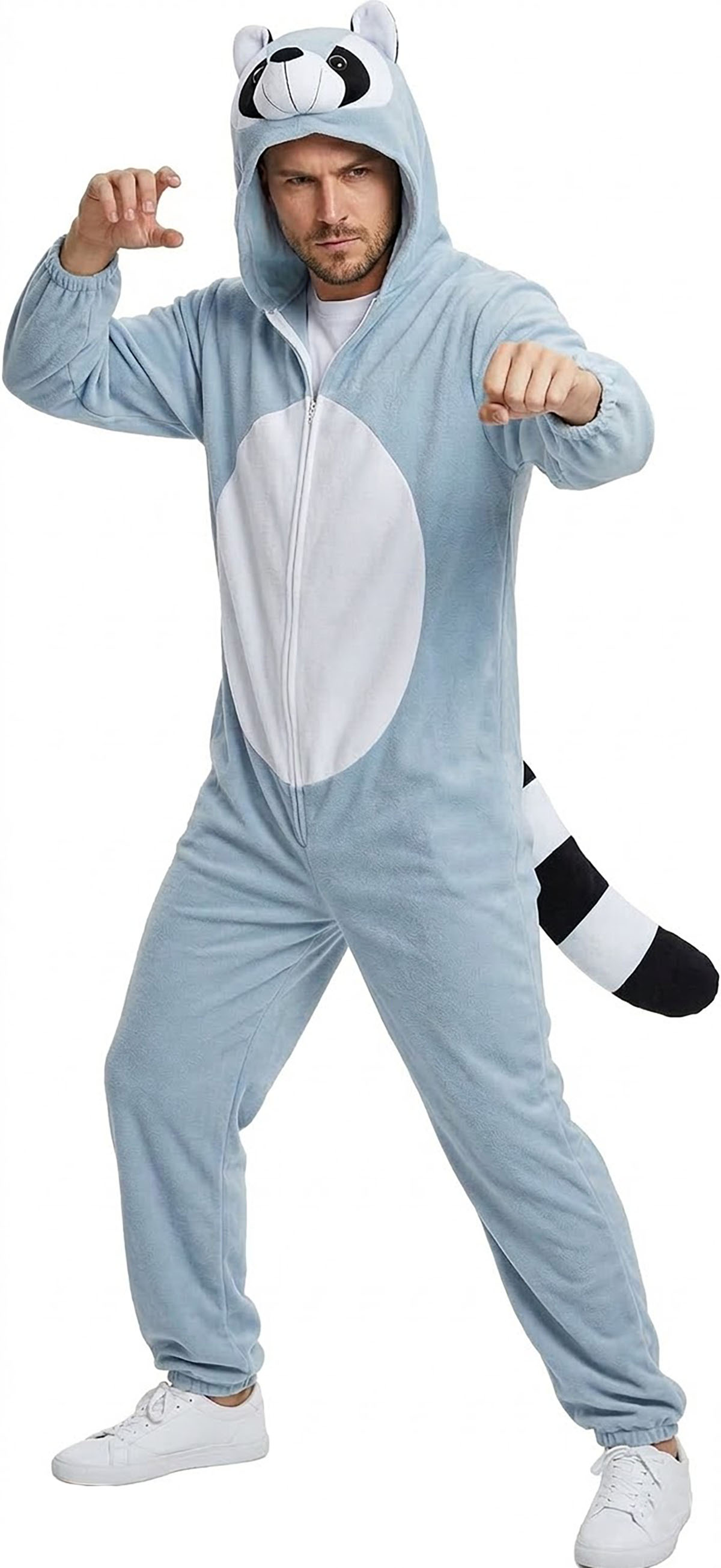 Waschbär Kostüm Herren Jumpsuit – Ideale Karneval Verkleidung & Party-Outfit – Leichter Tier-Ganzkörperanzug mit Kapuze & Schwanz