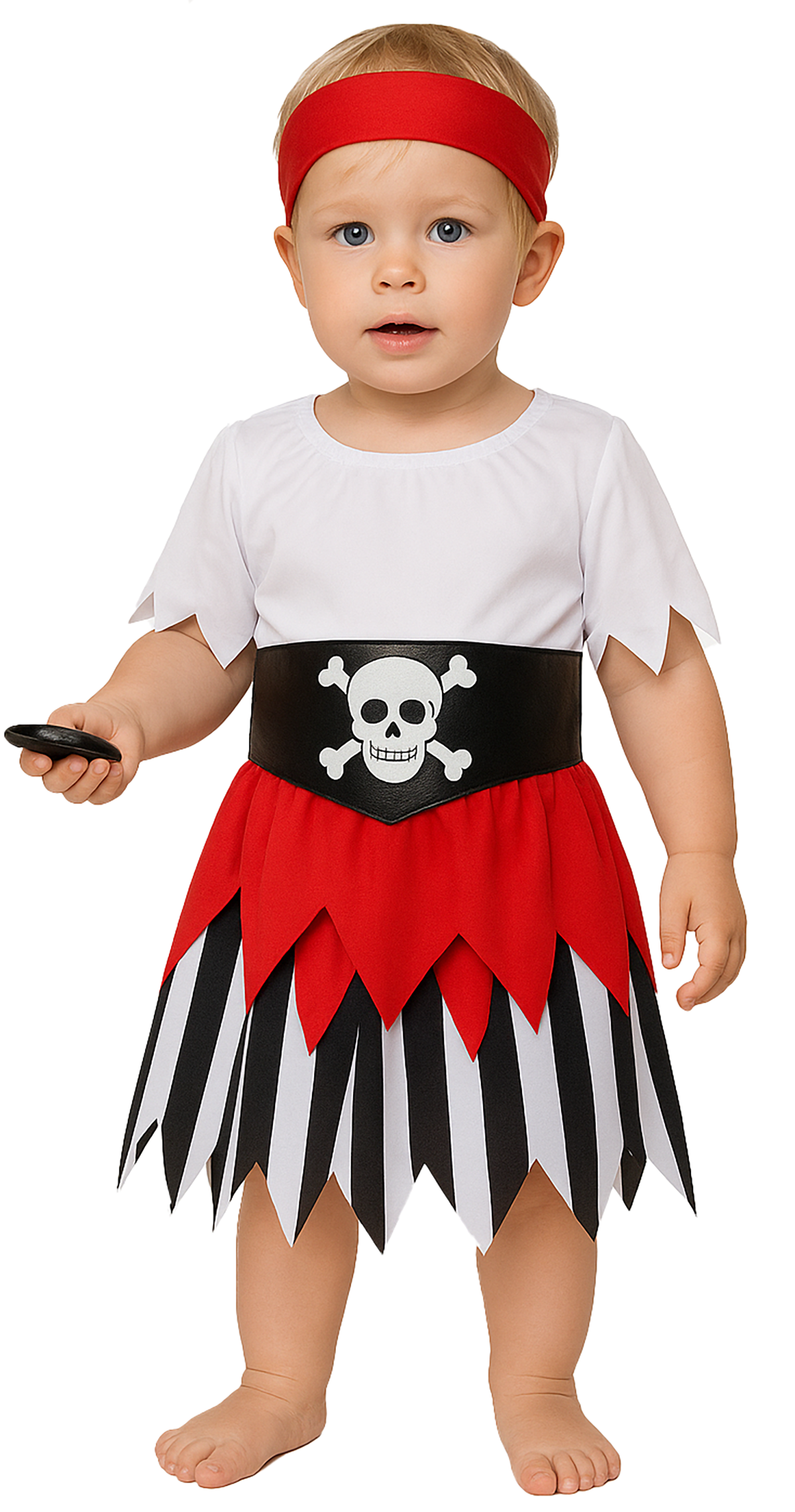 Der breite Gürtel mit Totenkopf-Symbol macht das Outfit komplett und verleiht der kleinen Piratin eine wilde Ausstrahlung.