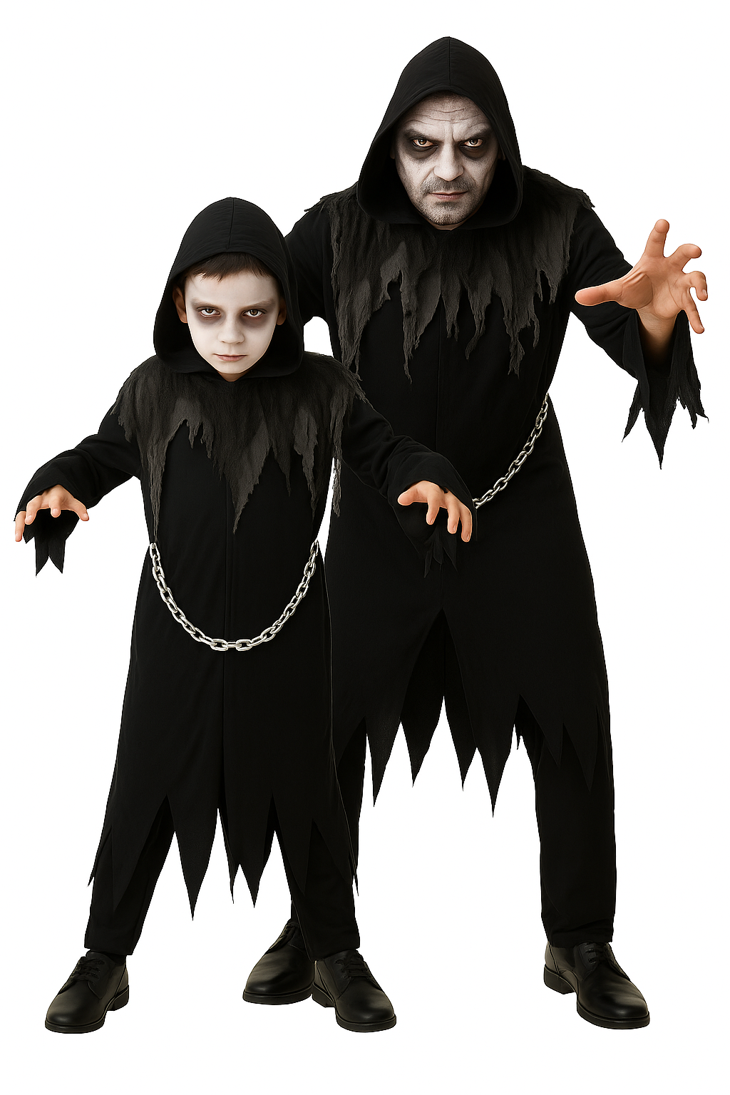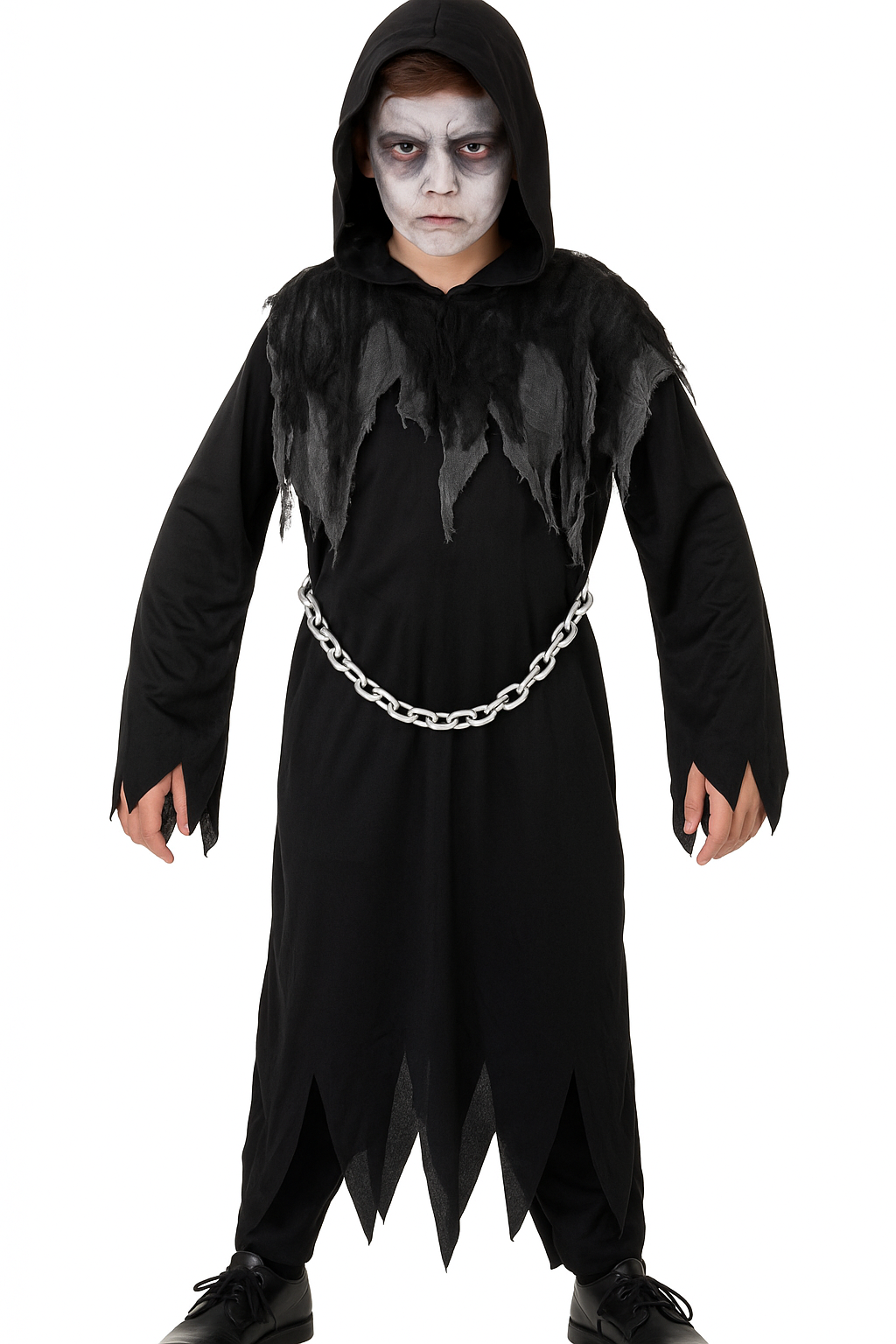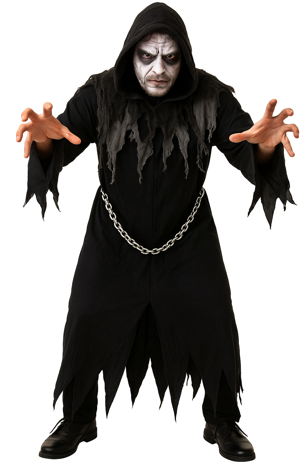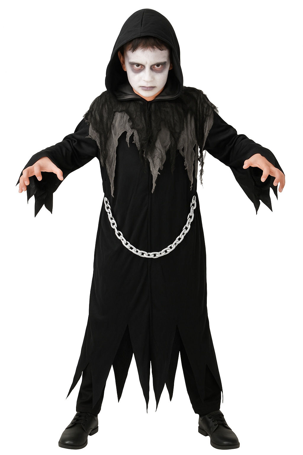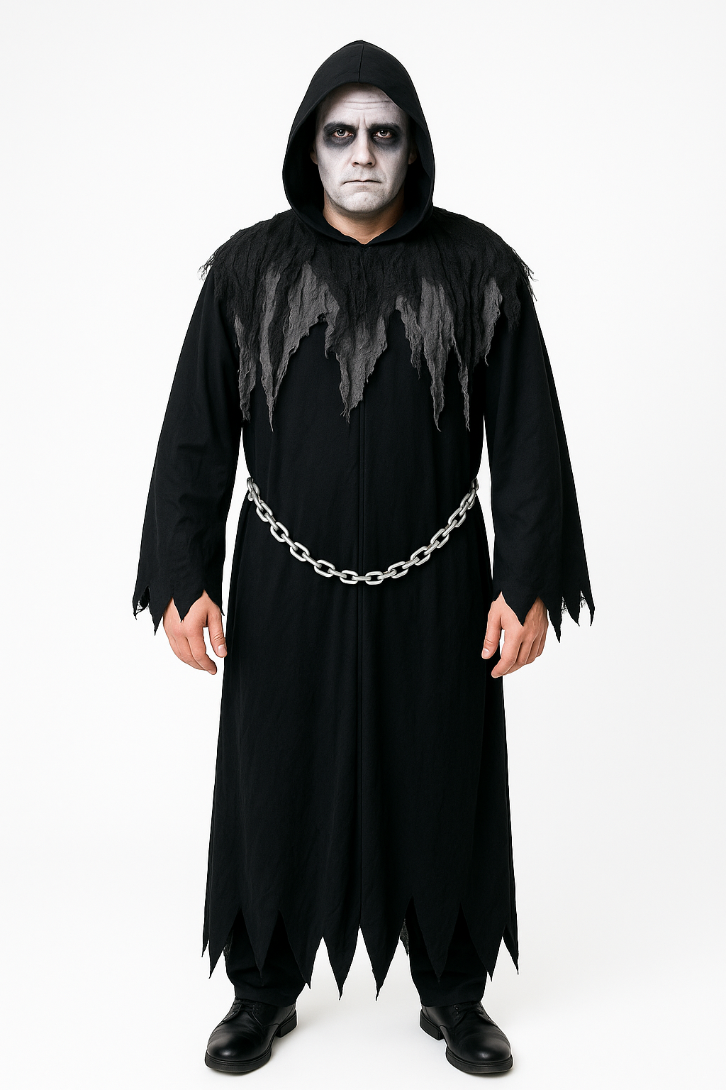 Dieses Sensenmann Kostüm verwandelt Kinder und Erwachsene gleichermaßen in den unheimlichen Grim Reaper. Ob für Halloween, Karneval, Fasching oder eine Horror-Mottoparty – die schwarze Robe mit Kapuze und Kette sorgt überall für Gänsehaut.