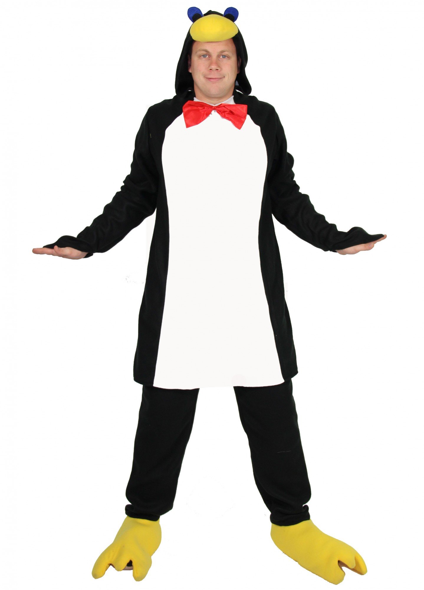 Dieses Pinguin Kostüm ist 2teilig: eine Tunika mit Kapuze als Pinguingesicht und eine Hose mit den gelben angenähten Füßen, die über die Schuhe getragen werden und mit einem Gummi gehalten werden.
